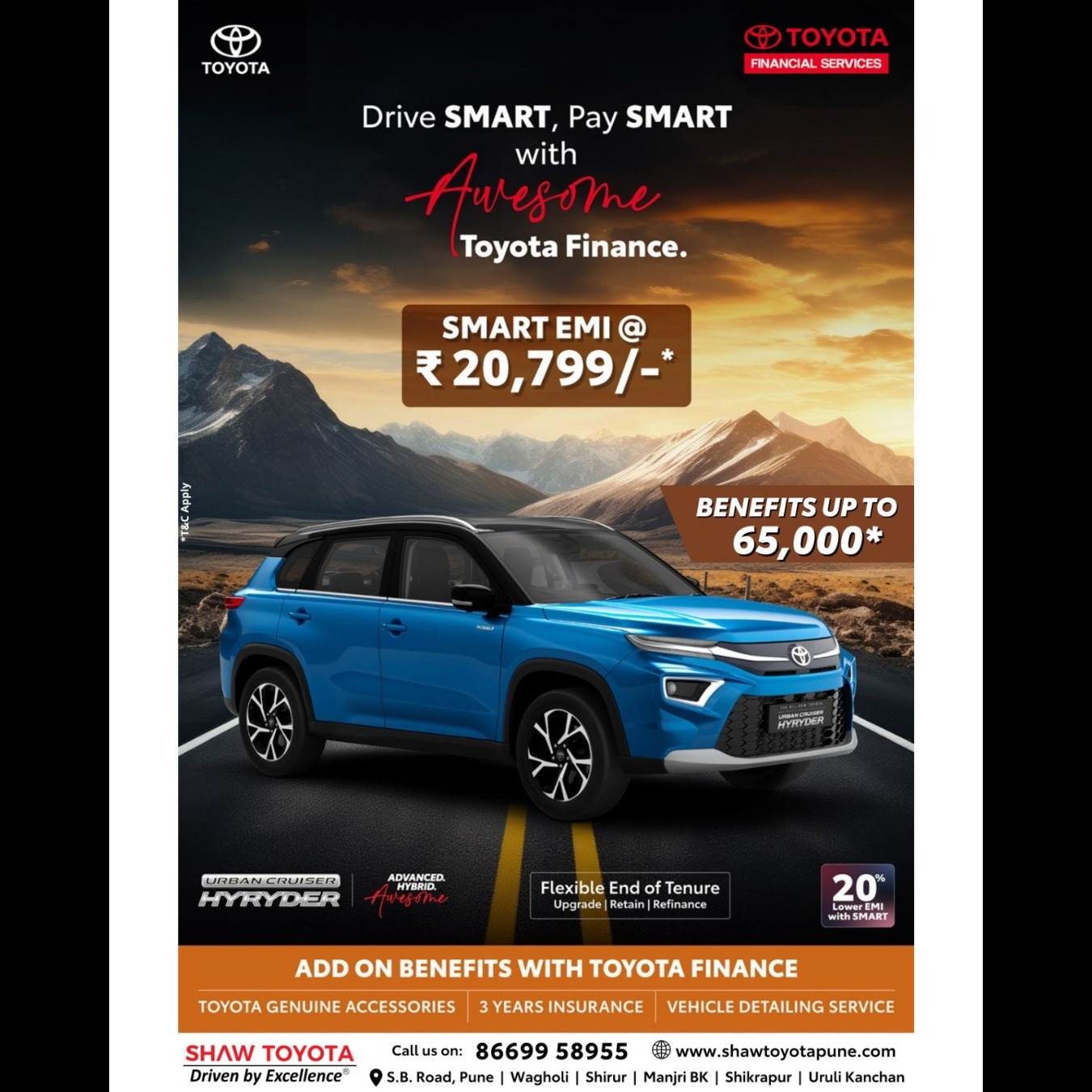 Bring home the Toyota Urban Cruiser Hyryder with Toyota Finance Smart EMI starting at just βΉ20, 799*.