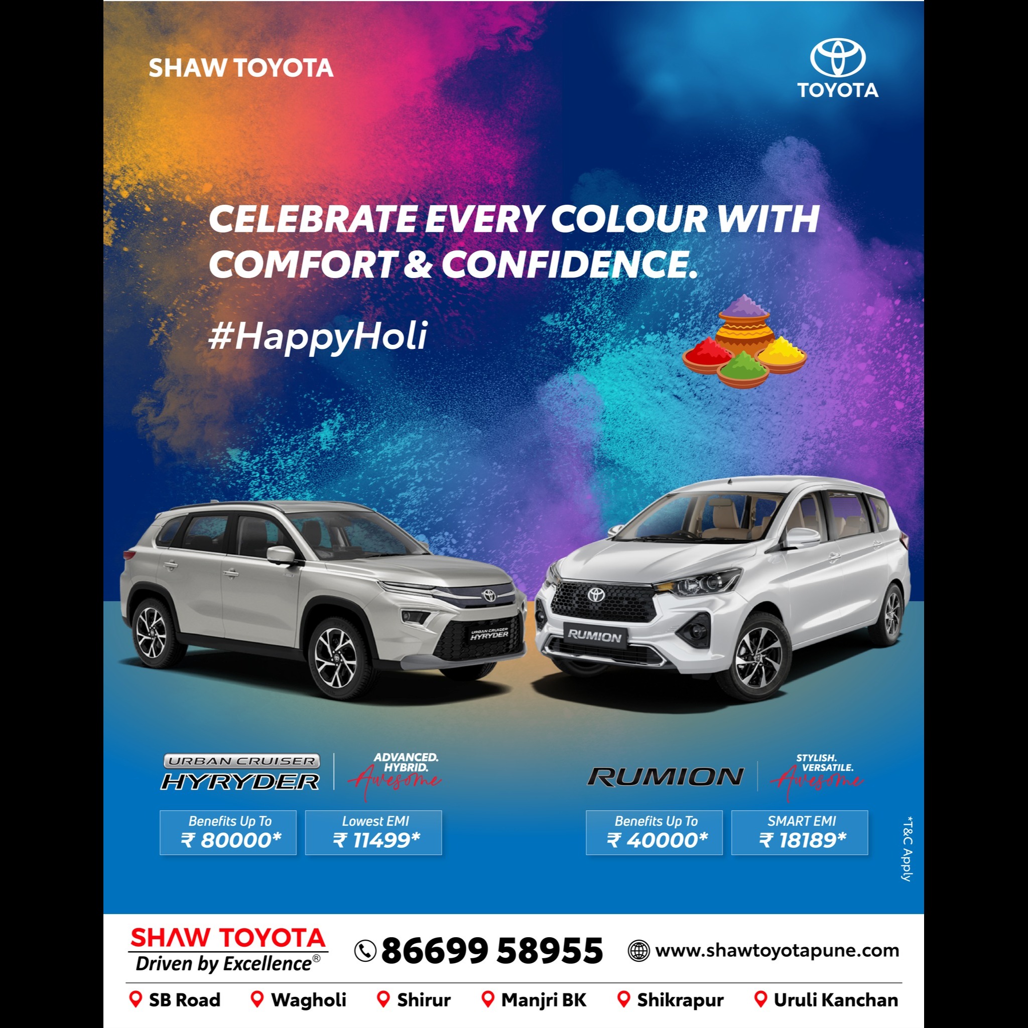 #ShawToyota #HappyHoli #UrbanCruiserHyryder #ToyotaRumion #HoliOffers #DrivenByExcellence #ToyotaIndia #ForYouWeAreForever