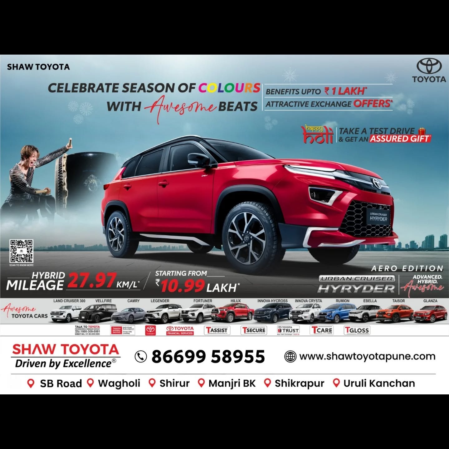Celebrate the season of colours with powerful performance and hybrid excellence. πŸŒˆπŸš— Bring home the Toyota Urban Cruiser Hyryder and enjoy benefits up to β‚Ή1 Lakh* with attractive exchange offers! Hybrid Mileage up to 27.97 km/l* | Starting from β‚Ή10.99 Lakh* Take a test drive this Holi & get an assured gift! 🎁 Visit Shaw Toyota today!